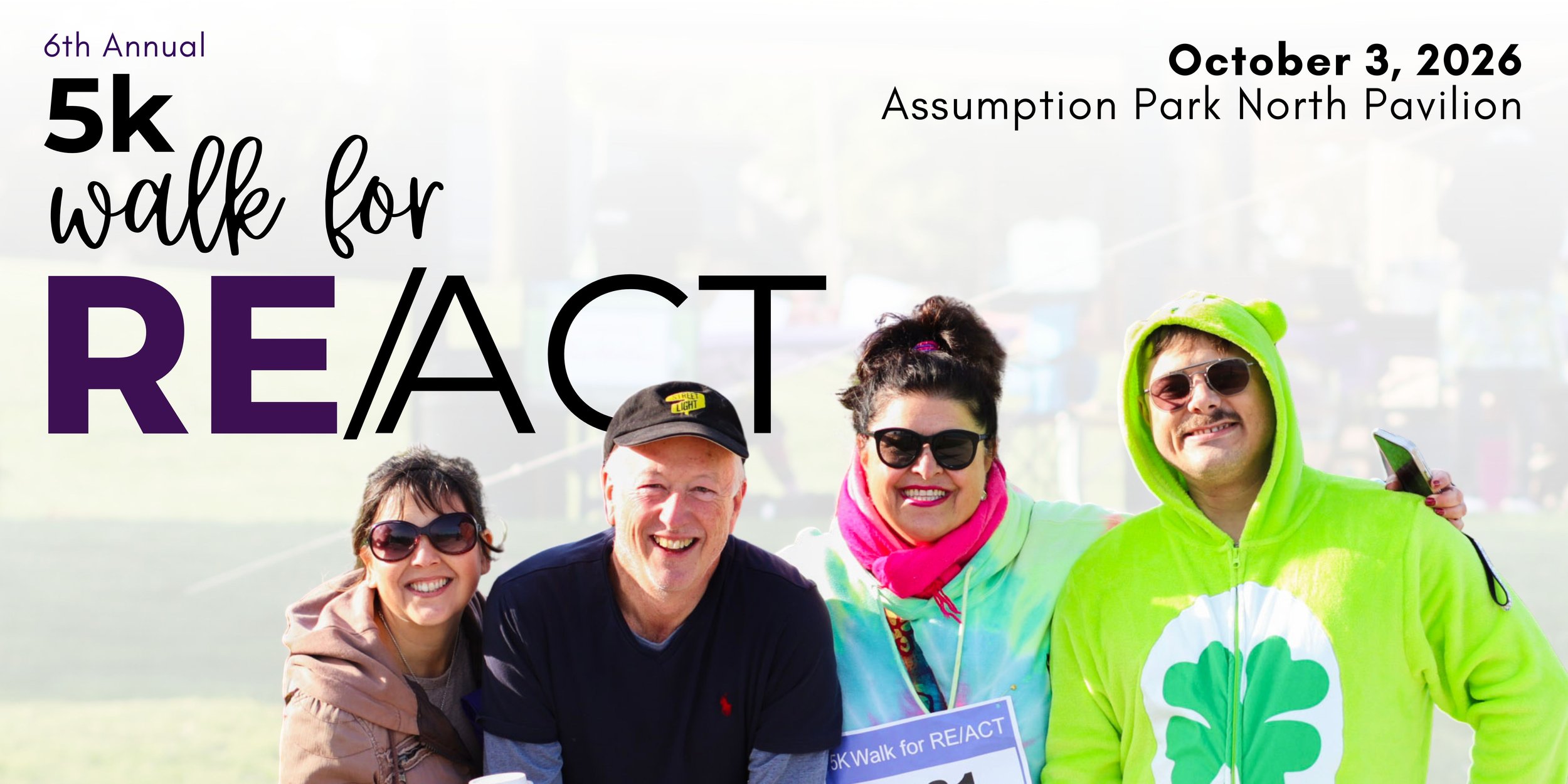 Join us on October 3, 2026, at Assumption Park North Pavilion for our 6th Annual 5k Walk for RE/ACT! Walk for a cause this fall, in support of RE/ACT Windsor-Essex, helping provide Recovery Education for Addictions and Complex Trauma for our Windsor-Essex community.